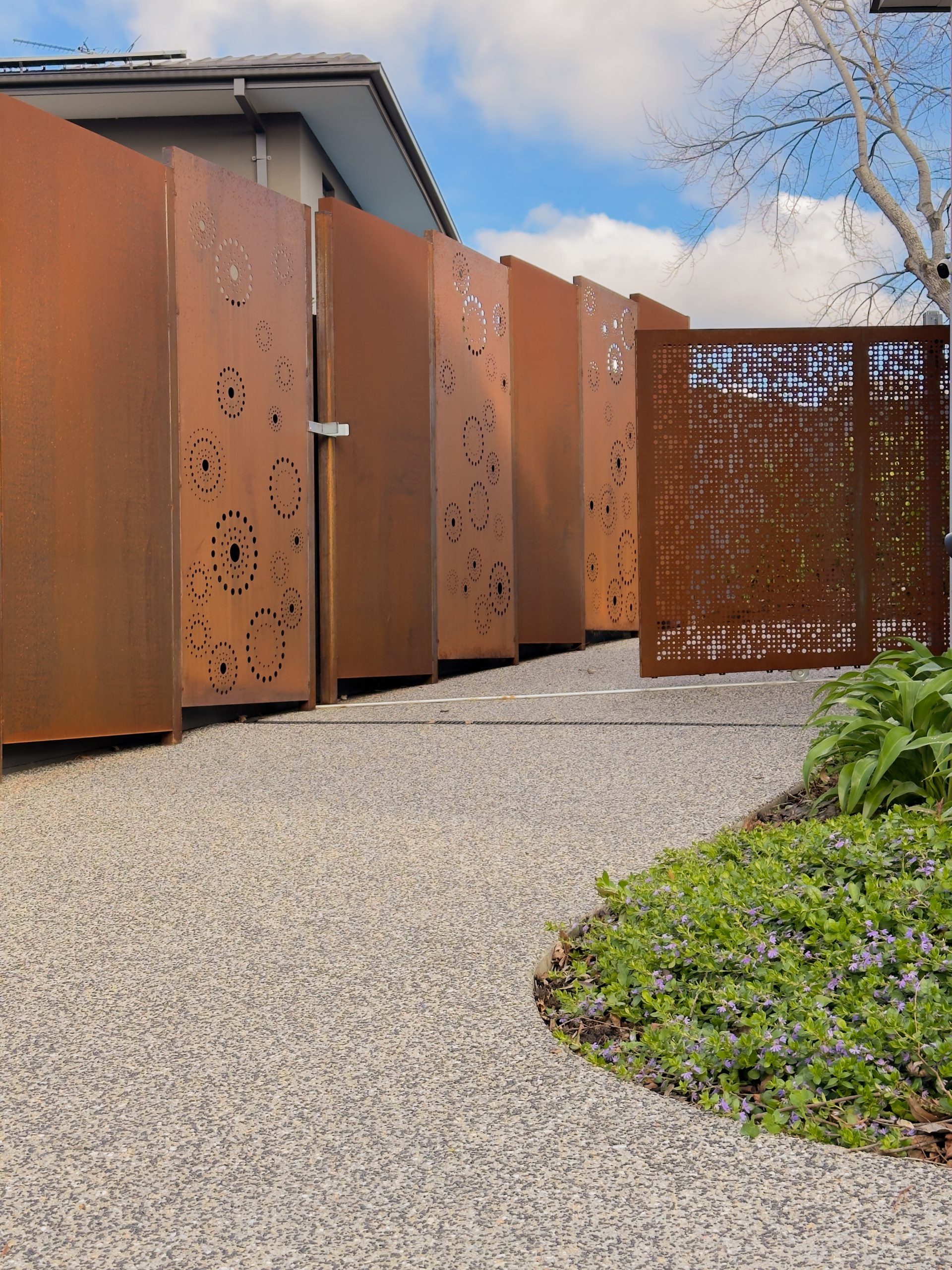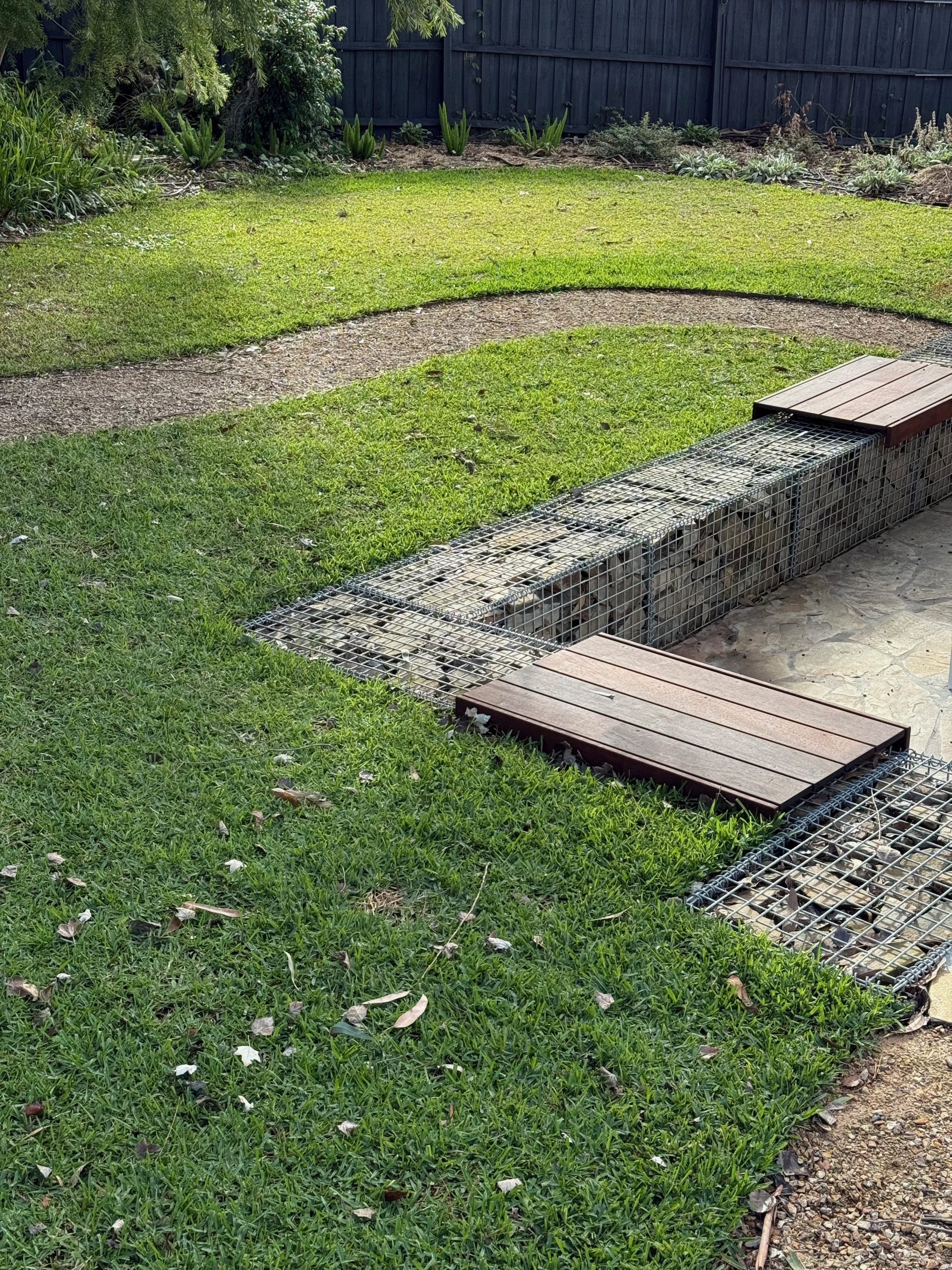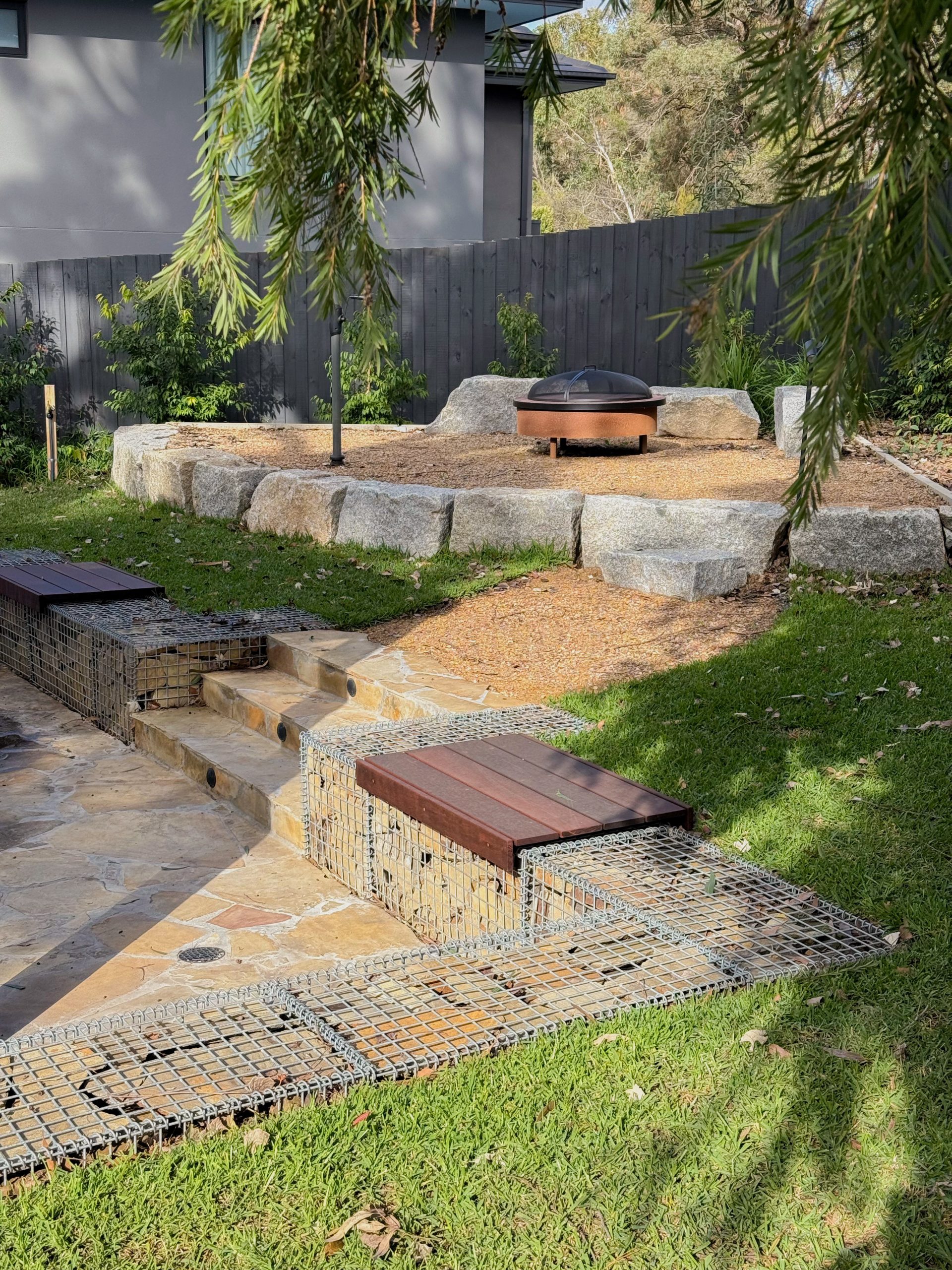 Mild steel laser-cut screens add sculptural privacy at the entrance, while exposed aggregate pathways provide clean, slip-resistant circulation. In the backyard, flat mudstone boulders form relaxed seating around a corten steel fire pit, anchored by lush Sir Walter Buffalo lawn. Gabion walls with Merbau timber caps introduce industrial texture and practical seating, seamlessly connecting the entertaining area to surrounding garden beds. Natural stone edging and low native planting soften transitions throughout, bringing balance to the contemporary materials palette.