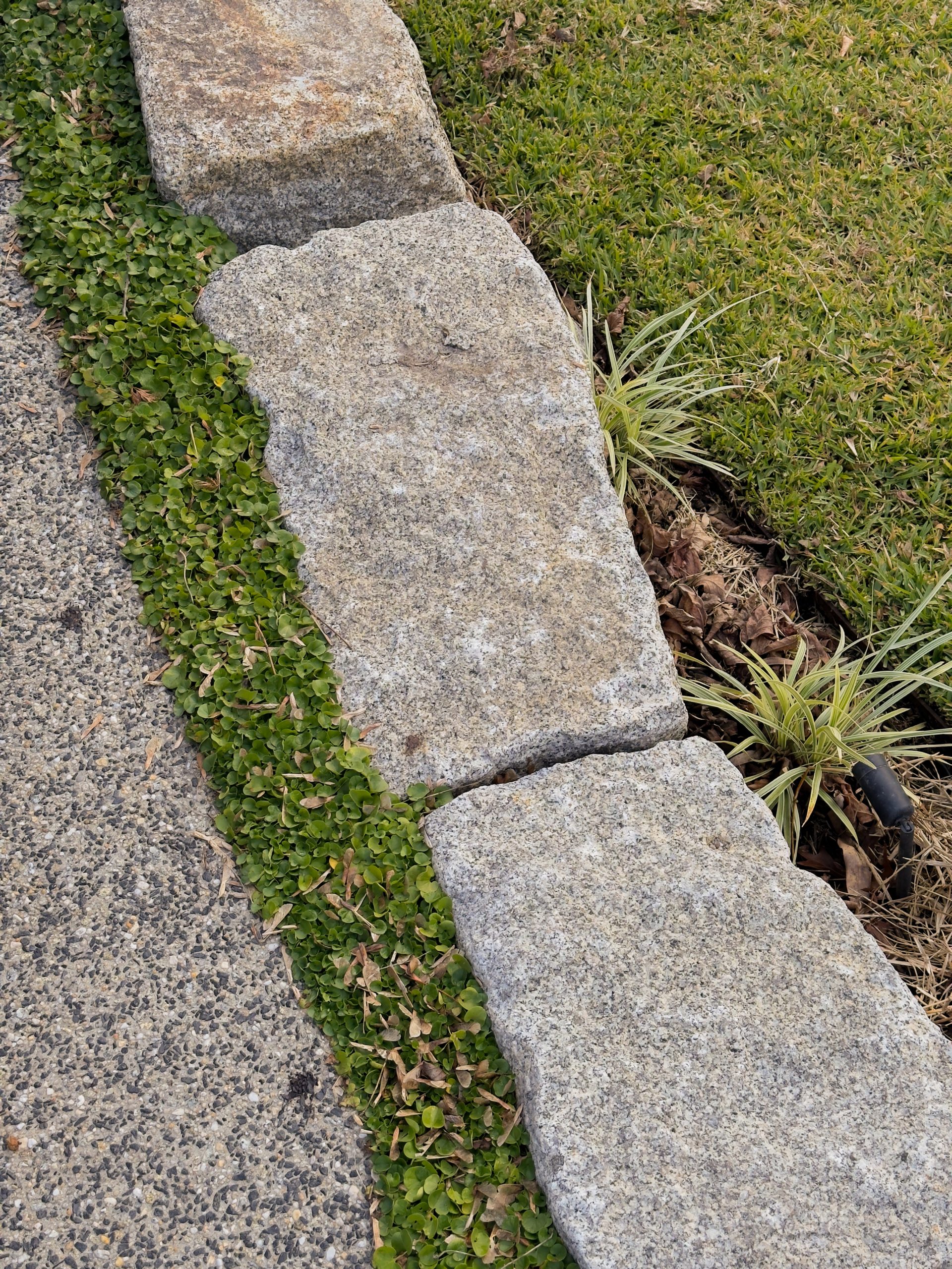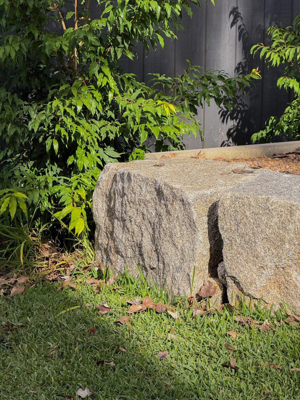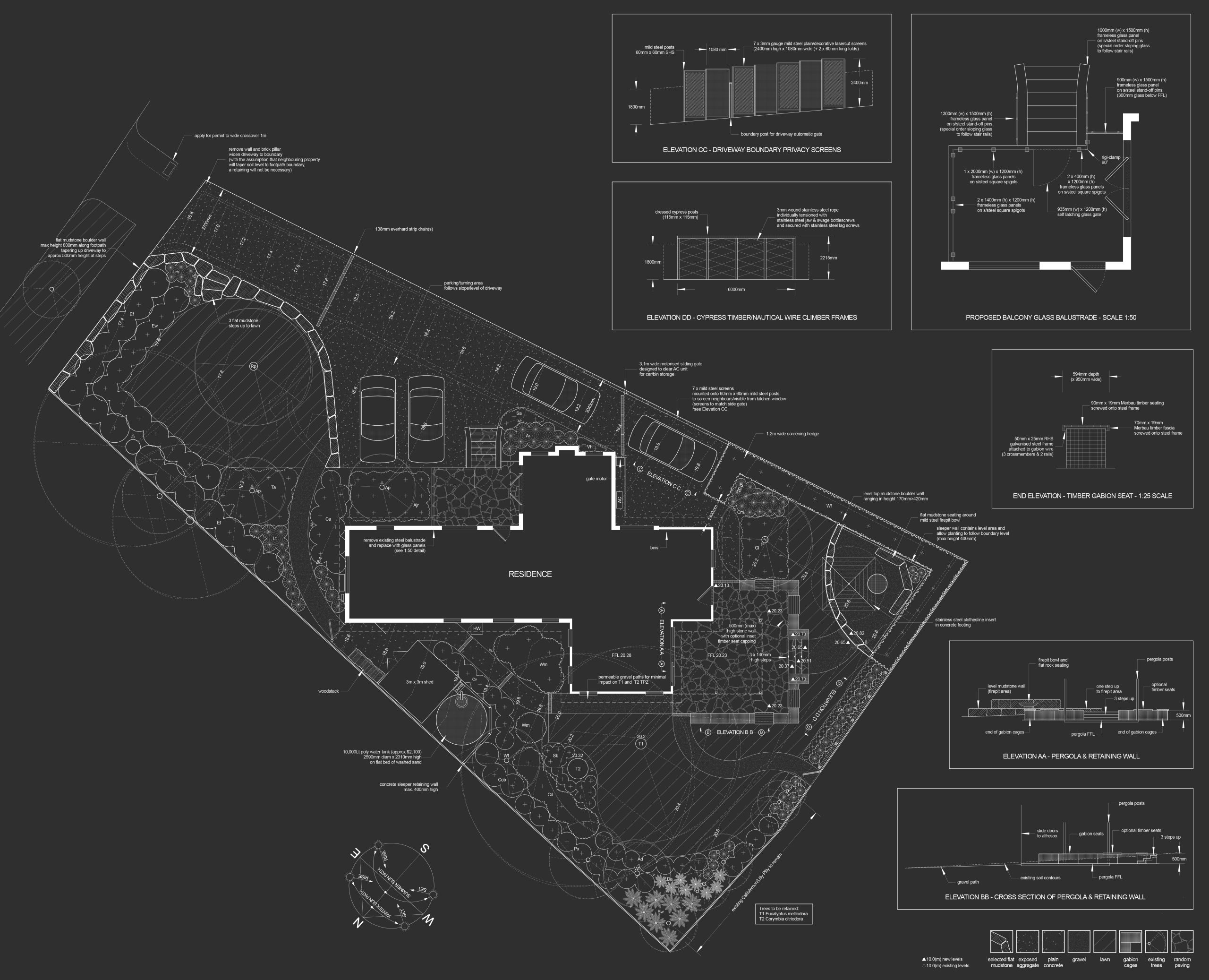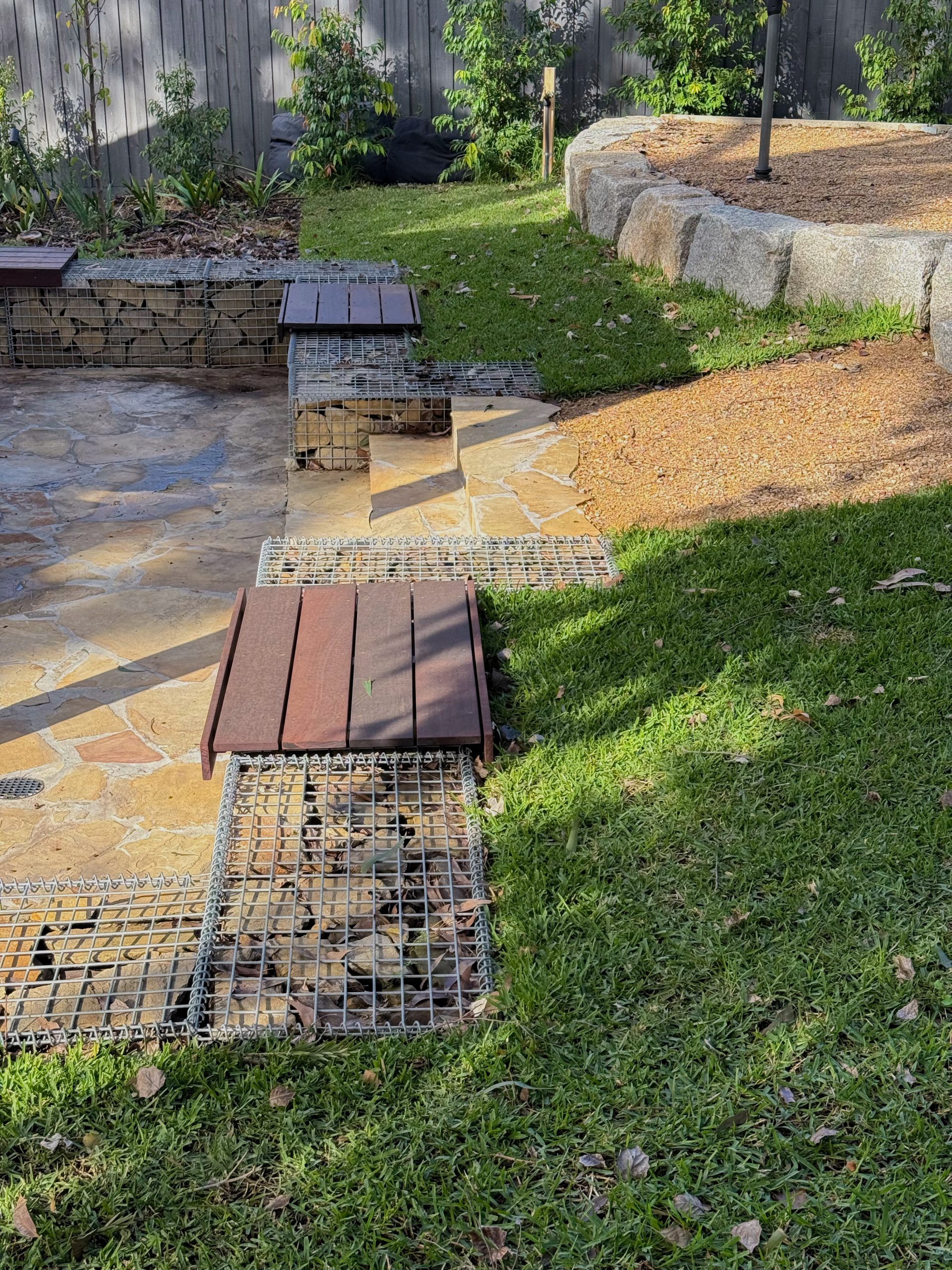 Mild steel laser-cut screens add sculptural privacy at the entrance, while exposed aggregate pathways provide clean, slip-resistant circulation. In the backyard, flat mudstone boulders form relaxed seating around a corten steel fire pit, anchored by lush Sir Walter Buffalo lawn. Gabion walls with Merbau timber caps introduce industrial texture and practical seating, seamlessly connecting the entertaining area to surrounding garden beds. Natural stone edging and low native planting soften transitions throughout, bringing balance to the contemporary materials palette.