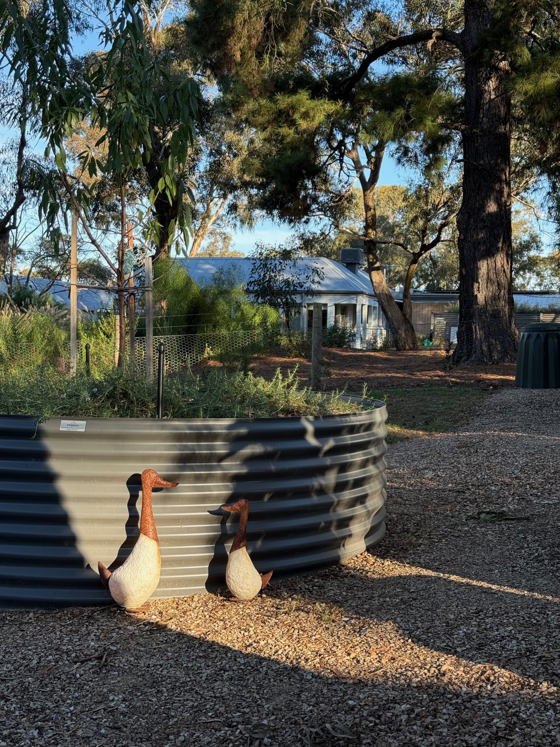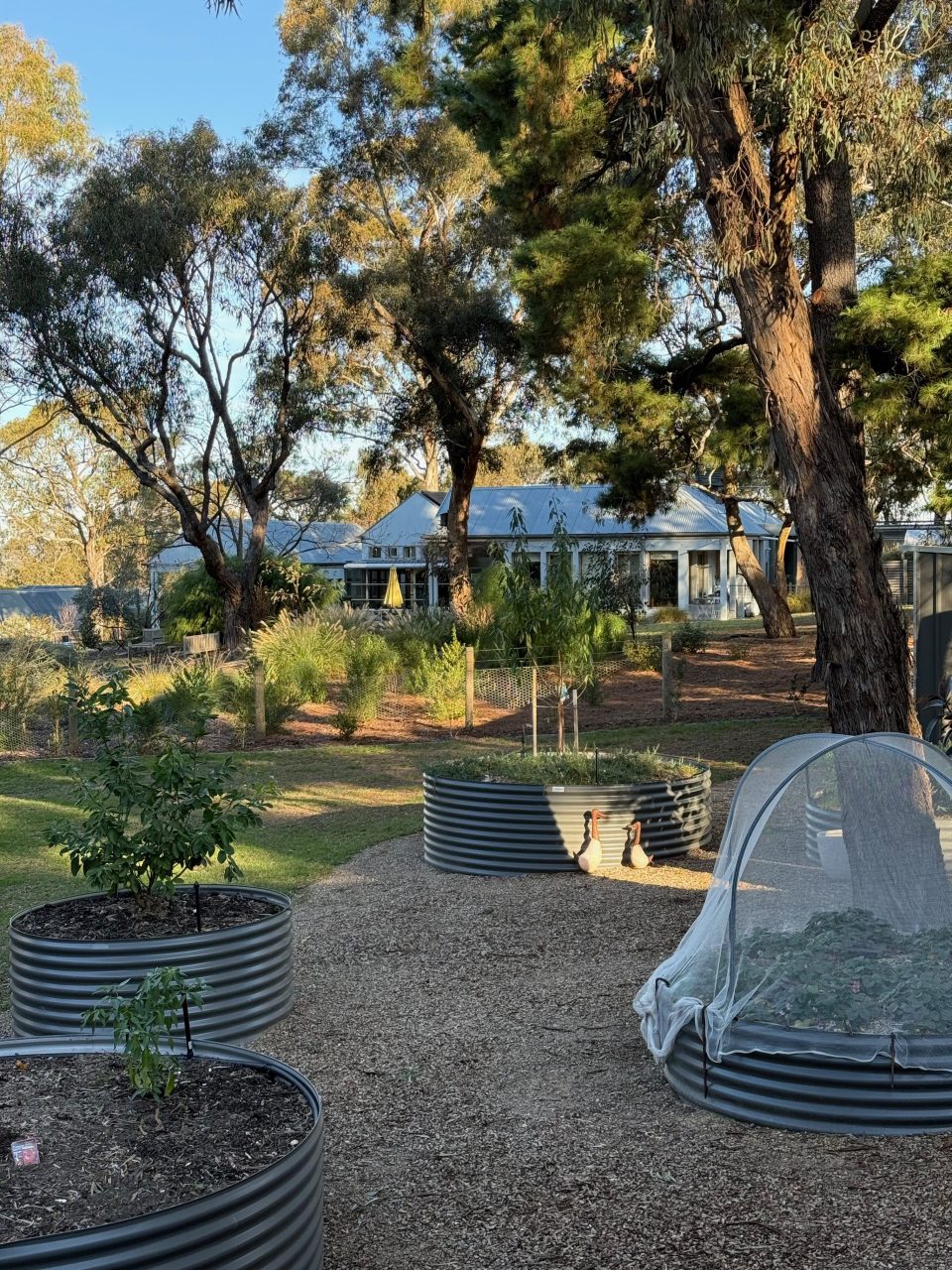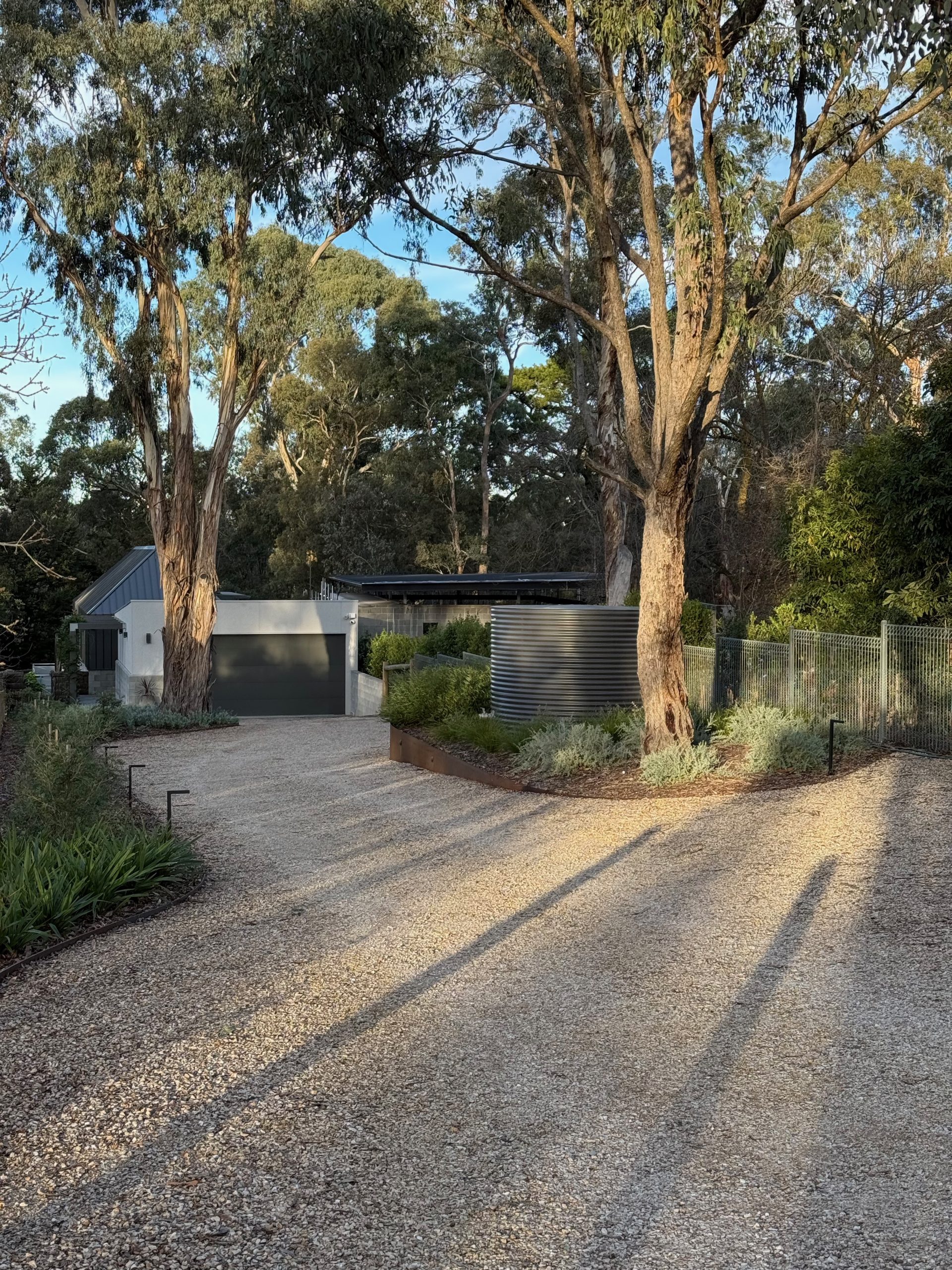 A split-level granite-paved courtyard and crisp granite steps provide a refined transition between house and garden, while mild steel edging and retaining walls introduce subtle, modern detailing. Raised Colorbond beds define the productive garden, offering structure for edible planting amid the natural landscape. Gravel pathways, generous open spaces, and soft native underplanting weave through mature eucalypts, preserving the sense of place. Integrated lighting and careful grading ensure the garden is as functional and welcoming by night as it is by day.
