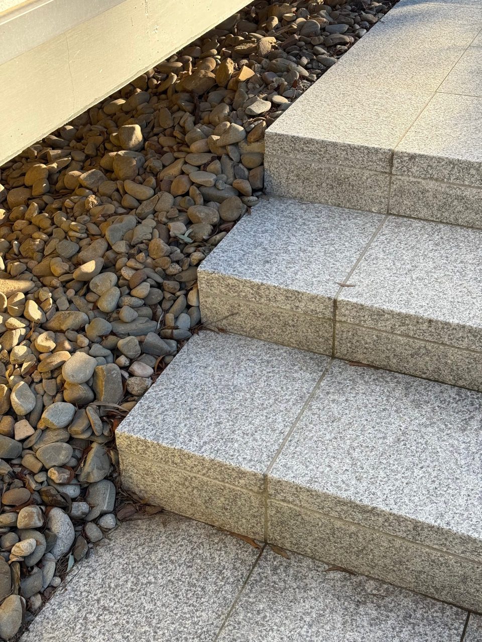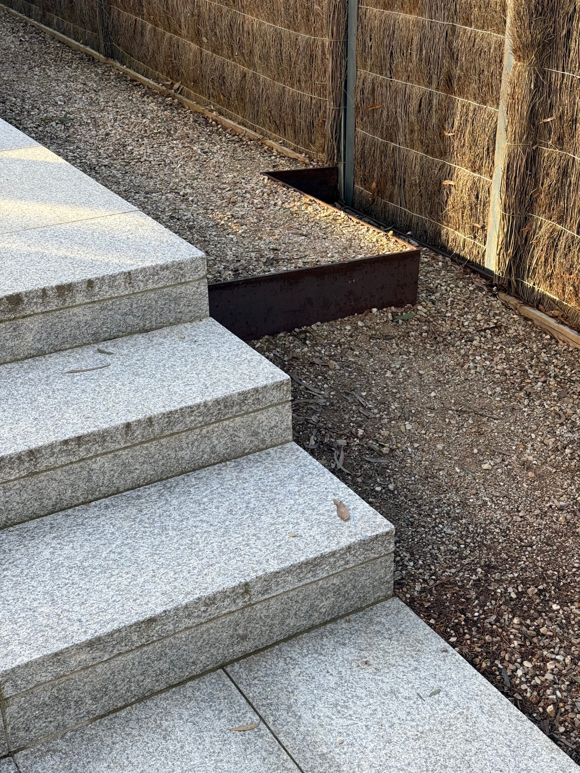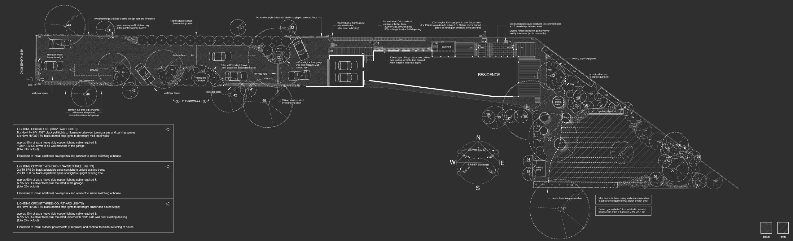 A split-level granite-paved courtyard and crisp granite steps provide a refined transition between house and garden, while mild steel edging and retaining walls introduce subtle, modern detailing. Raised Colorbond beds define the productive garden, offering structure for edible planting amid the natural landscape. Gravel pathways, generous open spaces, and soft native underplanting weave through mature eucalypts, preserving the sense of place. Integrated lighting and careful grading ensure the garden is as functional and welcoming by night as it is by day.